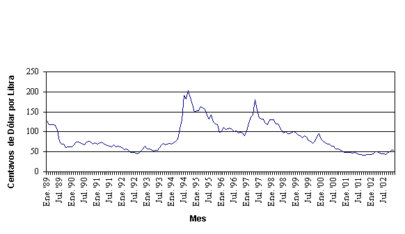 Como era de esperarse, el colapso de las restricciones a las exportaciones llevó a precios mundiales más bajos (Figura 1). Los precios se dispararon a mediados de los noventa debido a heladas y sequías en Brasil, pero luego continuó con su trayectoria hacia abajo, hundiéndose a puntos sin precedentes en los últimos años. A lo largo de la reciente caída, la oferta ha superado constantemente a la demanda (Tabla 1). Los precios se recuperaron modestamente durante el 2002, pero continúan oscilando cerca de puntos históricamente bajos—alrededor de 50 centavos de dólar la libra.